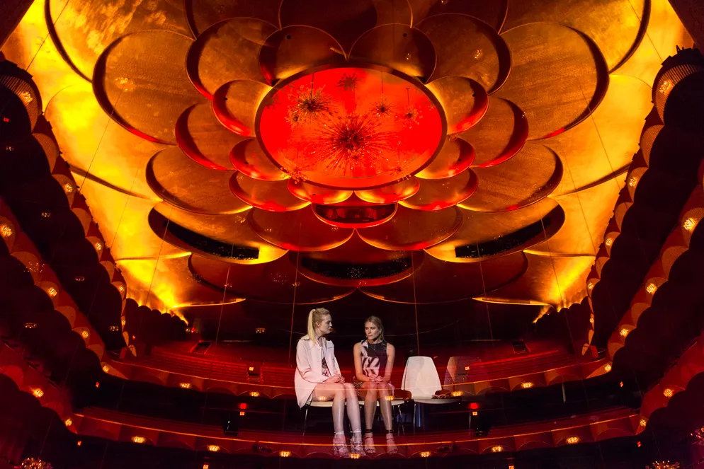 multiple revisions and ultimately studied the show to not only prepare a design but to explain the show to the many teams of professionals at the met. The show was set in reverse making the expansive auditorium of the met the backdrop for the production.